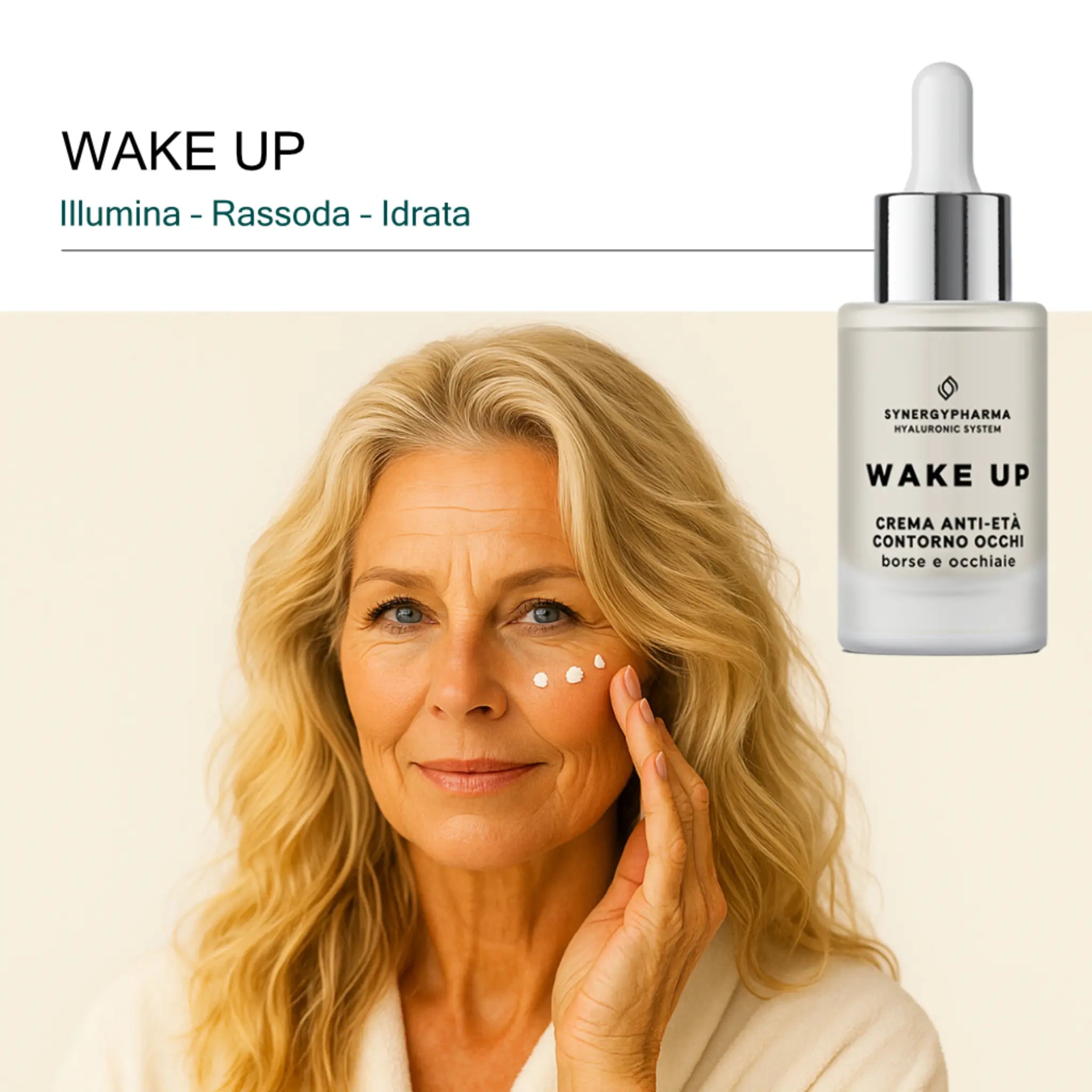 La zona del contorno occhi, sottile e fragile, si segna precocemente a causa di mimica facciale, scarsa idratazione e ridotto apporto di nutrienti. Wake Up idrata in profondità, migliora l’elasticità cutanea e attenua visibilmente i segni del tempo grazie alla sua formula specifica e al leggero effetto tensore.
